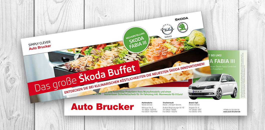 Unser Kunde Auto Brucker ist der Skoda- und Opel-Service Partner in der Region – vor kurzem erweiterte sich das Unternehmen außerdem mit zwei Volkswagen Filialen in Thüringen und benötigte neue Print-Werbemittel.